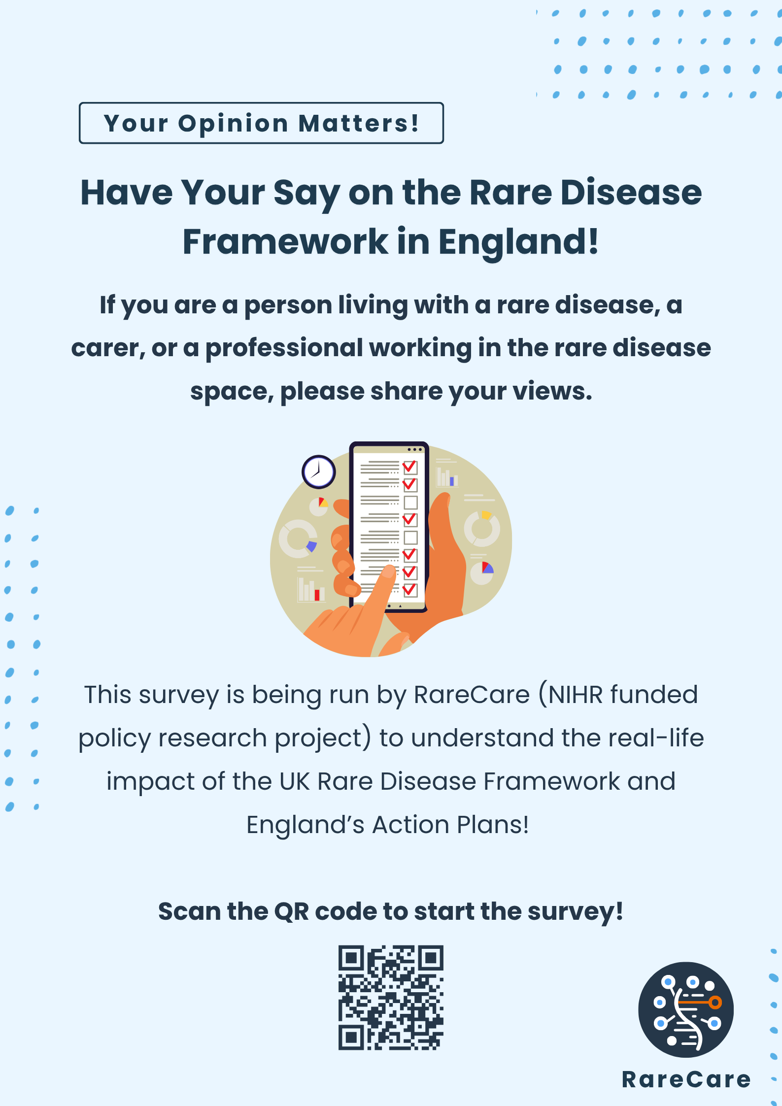 We are inviting people living with rare conditions and/or their carers to take part in interviews and focus groups for the RareCare project. This research is part of an independent evaluation of England’s Rare Disease Framework and Action Plans.
